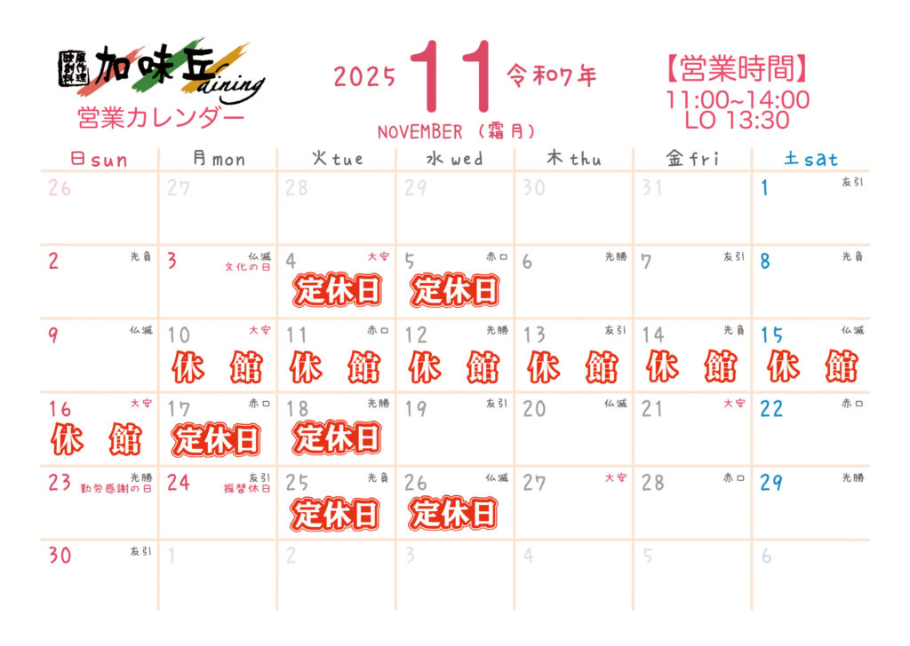 【営業時間】 11:00~14:00(ラストオーダー13:30)