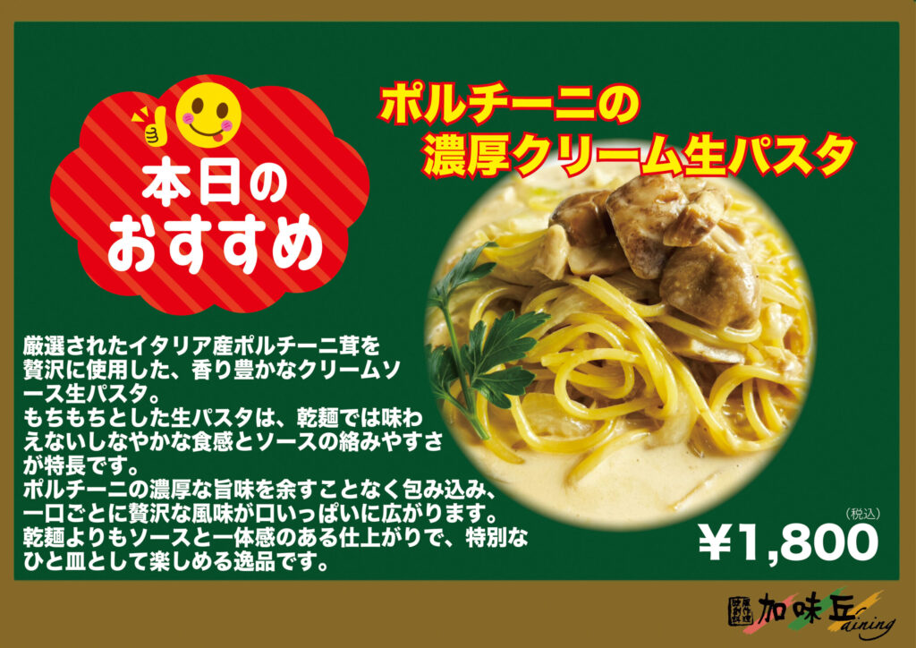今日のランチメニューおすすめは「ポルチーニの濃厚クリーム生パスタ」になります!!