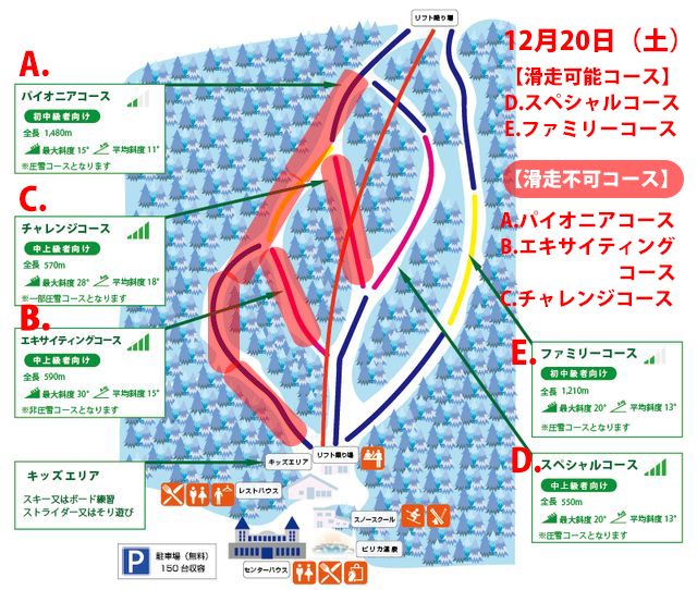 ※週末はプラス気温の予報です。融雪により、安全な状態を維持できないと判断した場合は、営業を中止場合もありますので、ご了承下さいませ。