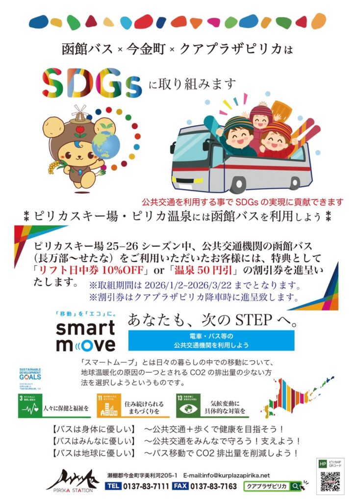 スキー場や温泉への移動を公共交通機関「函館バス」を使用しエコにする「スマートムーブ」と呼ばれる働きをすることで、お客様自身もSDGsに貢献できます。