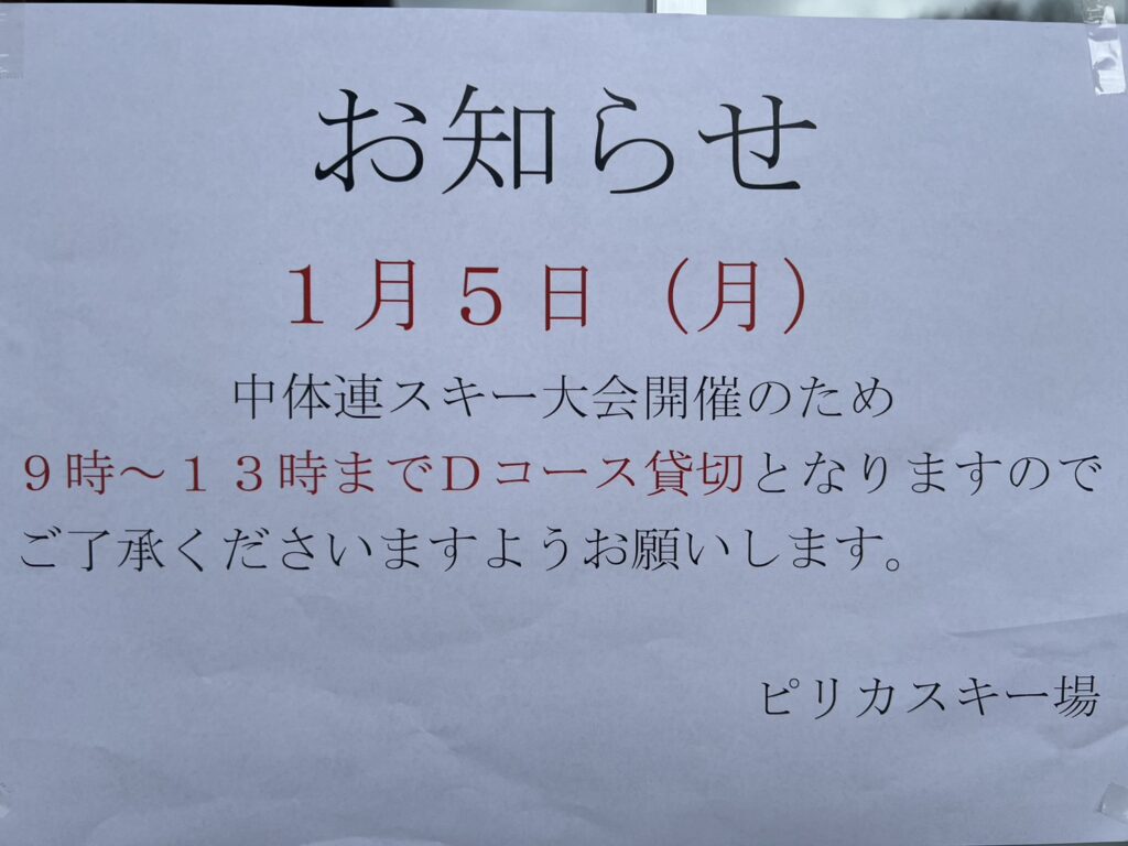 函館・渡島・檜山地区中体連スキー大会開催のため、1月5日(月)9時~13時までDコース貸し切りとなります。