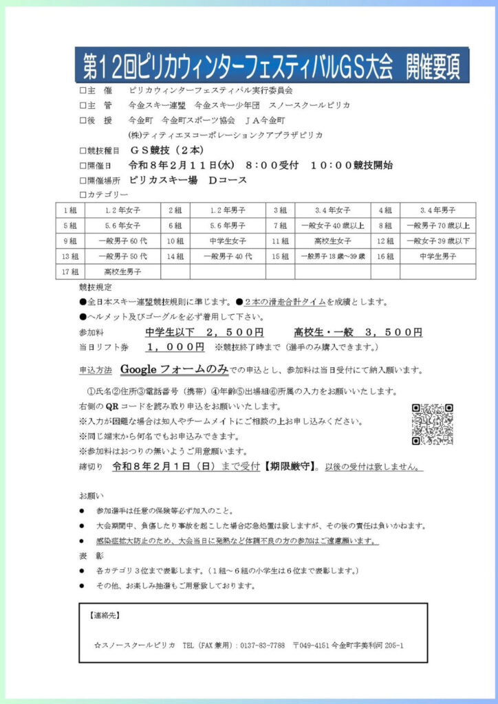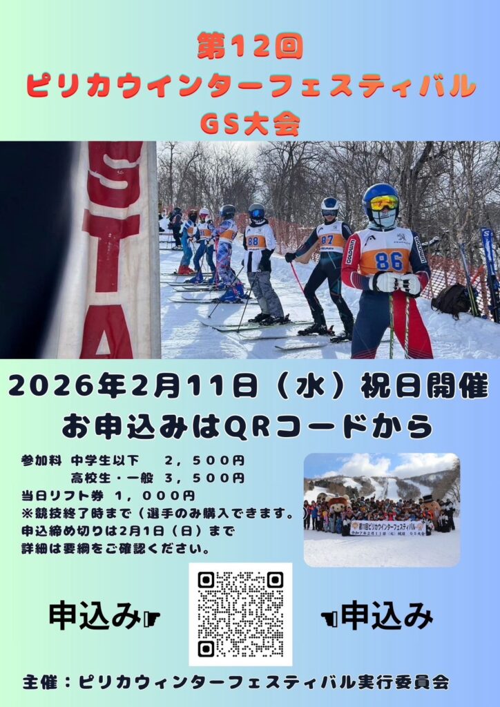 毎年恒例となった冬のお祭り「ピリカウィンターフェスティバル」と同日開催となるGS大会の要項がリリースされました。