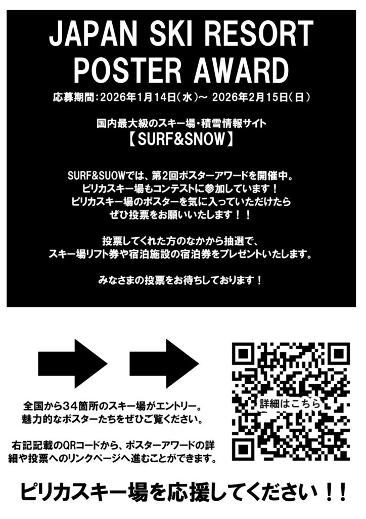 国内最大級のスキー場情報サイト「SURF&SNOW」で開催中のポスターコンテストにピリカスキー場でも参加しています。
